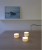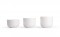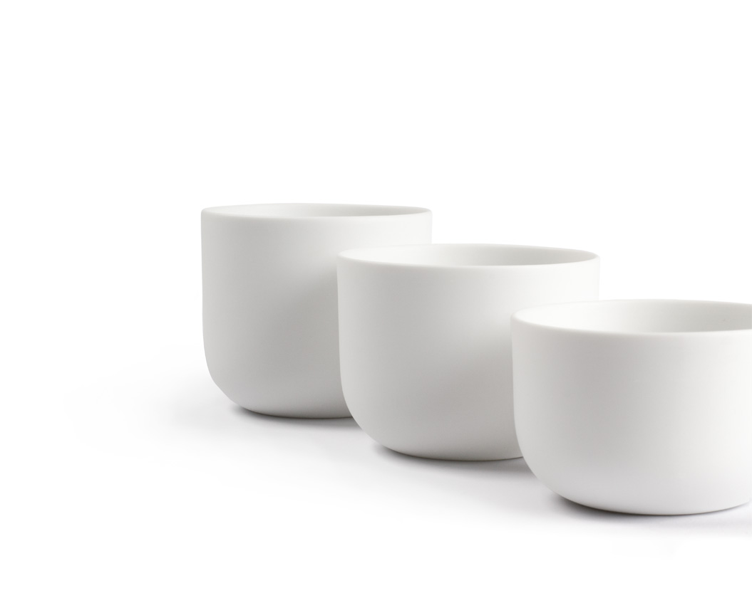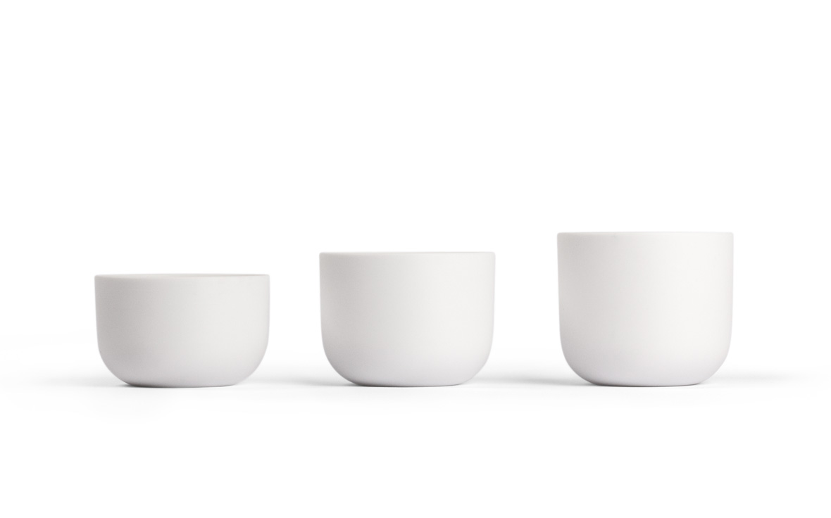 A trio in cream-white matte bisque, which is the thinner, unglazed version of porcelain. The translucency of the material allows for a warm, radiant feeling once candles are lit within. The rounded bottom edge helps give the impression of the tea light holders floating just above the surface of the table.