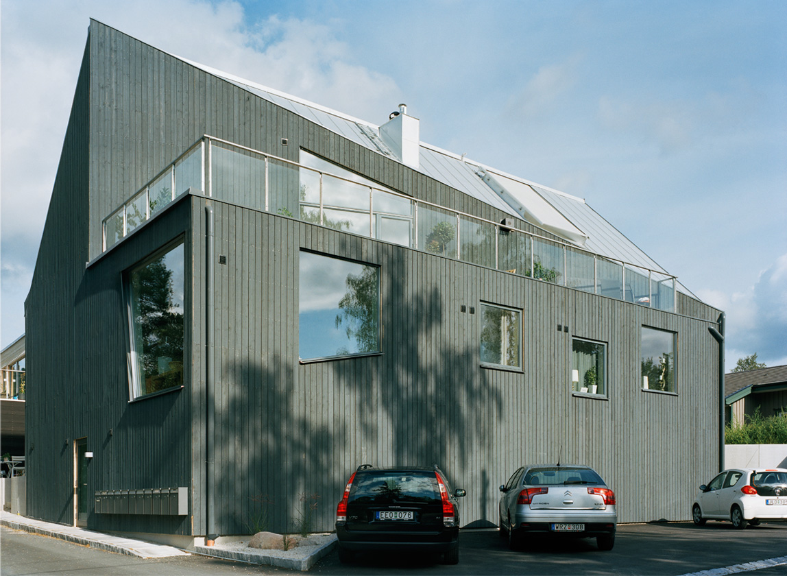 The Eriksvik house is a semi-detached house, containing two living spaces, each with two storeys. Because of local building regulations demanding a pitched roof, the gable elevations show a perfectly traditional house with a single-pitch roof. But a geometrical cut-away creates a triangular roof terrace on each side, one for each living space.