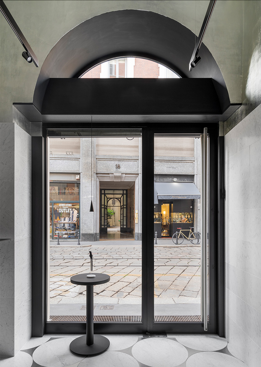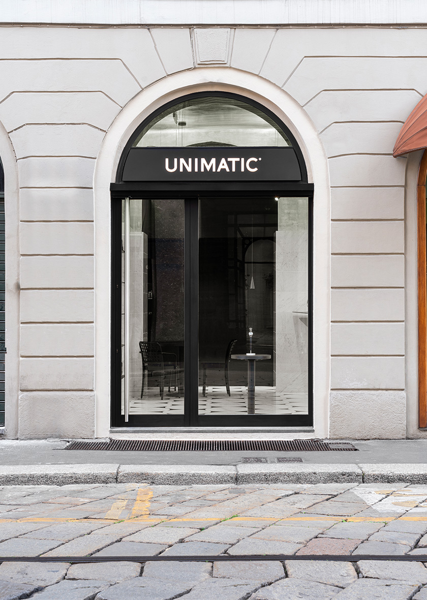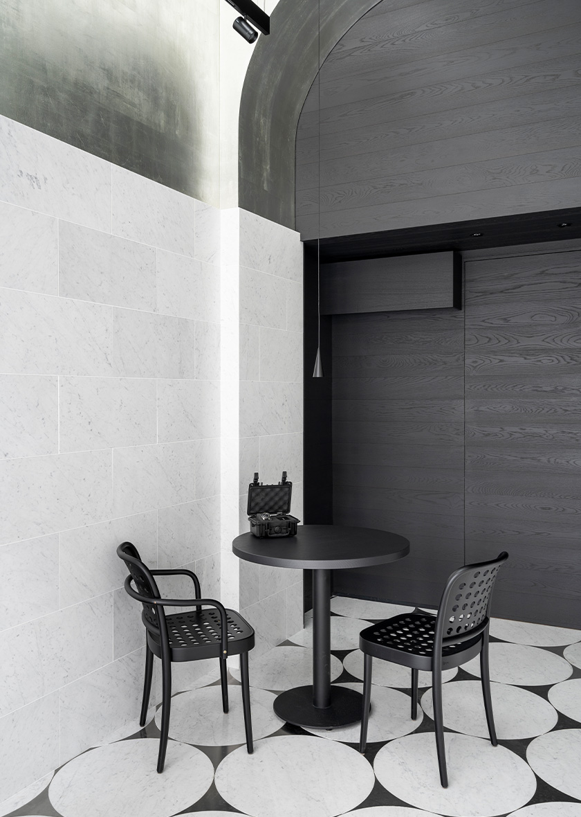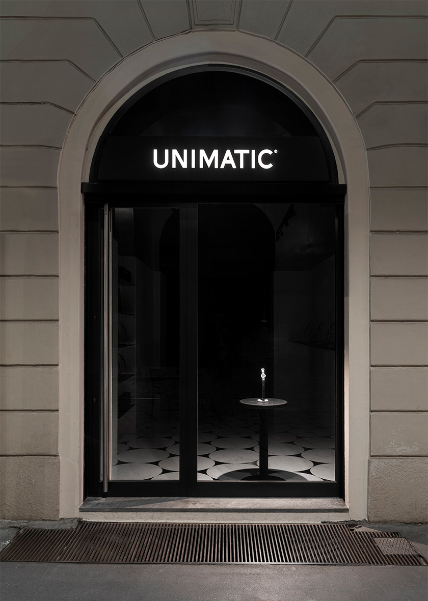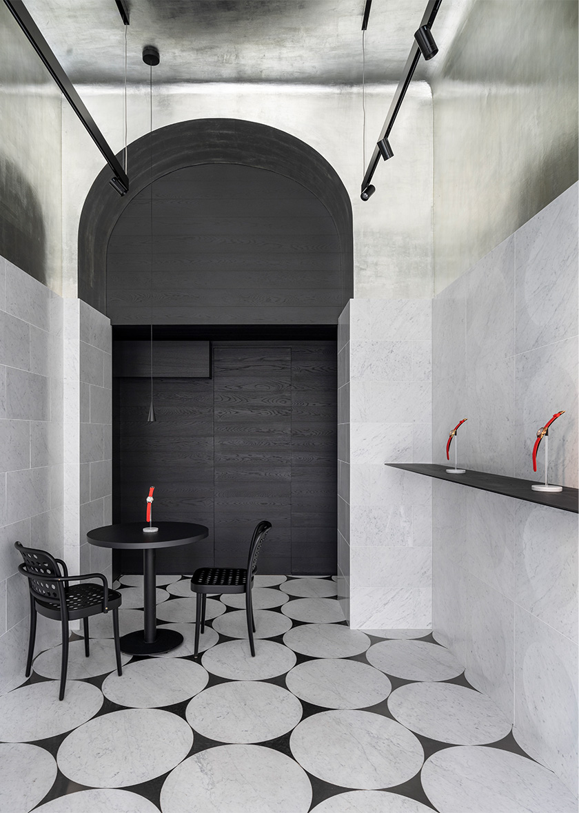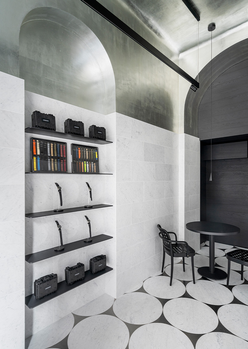 The metallic sheen of the leaf silver on the ceiling, together with the blackened-wood furnishings and the pale tone of the marble, combine to represent the colour scheme of the Unimatic brand. The refinement and harmony of the three crafts serve as a tribute to the Unimatic watches.